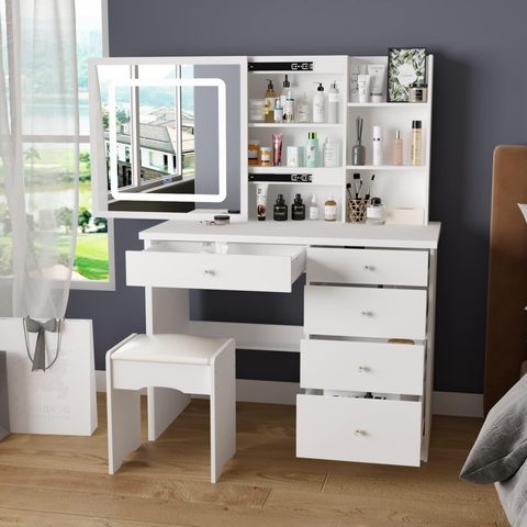 שולחן איפור לבן חדר שינה מגירה גדולה ושולחן אחסון שלוש מפלסים שולחן איפור עם מראה ואור בהירות מתכוונן